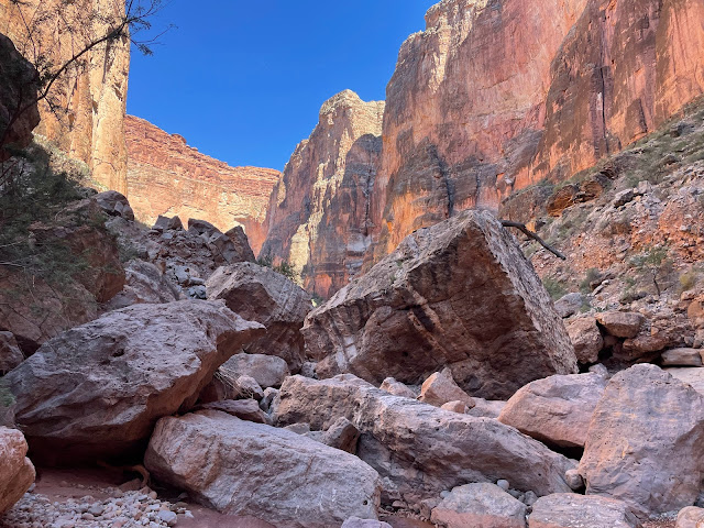 Next morning I continued downstream past Pagano canyon, which will bear revisiting in the future, and down “the chute” which took my breath away standing at the top until I perceived the faint use trail leading through this jumble of rocks. Looks terrifying from on top but really is pretty much a nothingburger once you start moving down and find your way into the very steep and narrow middle section. Once past that you can walk out to the left and descend a talus slope right next to the left wall.